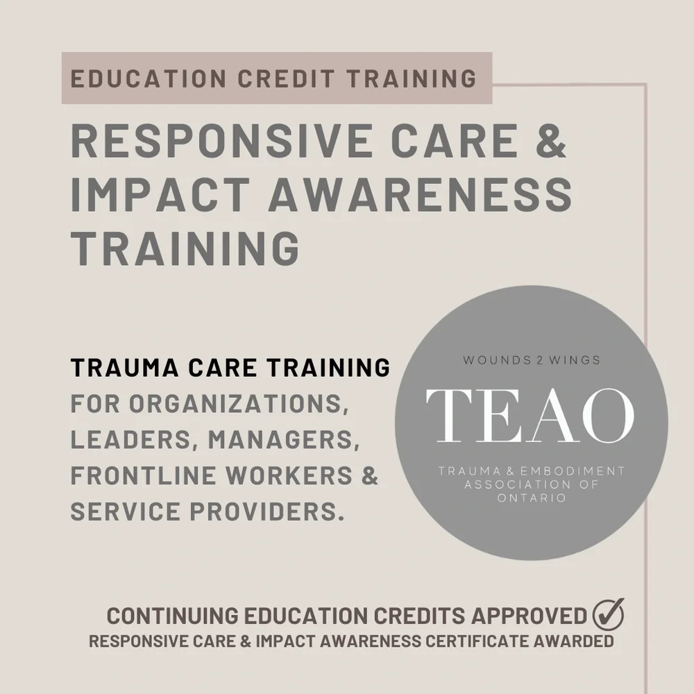 As a Trauma and Embodiment Organization for organizations, leaders, managers, frontline, teachers, first responders, clinicians, practitioners, doctors, nurses, students in the field of helping, graduates of post-secondary education, post secondary institutions etc., Our training has been approved for Continuing Education Credits (CECs): 12 CECs through the Ontario Association of Mental Health Professionals (OAMHP)*.